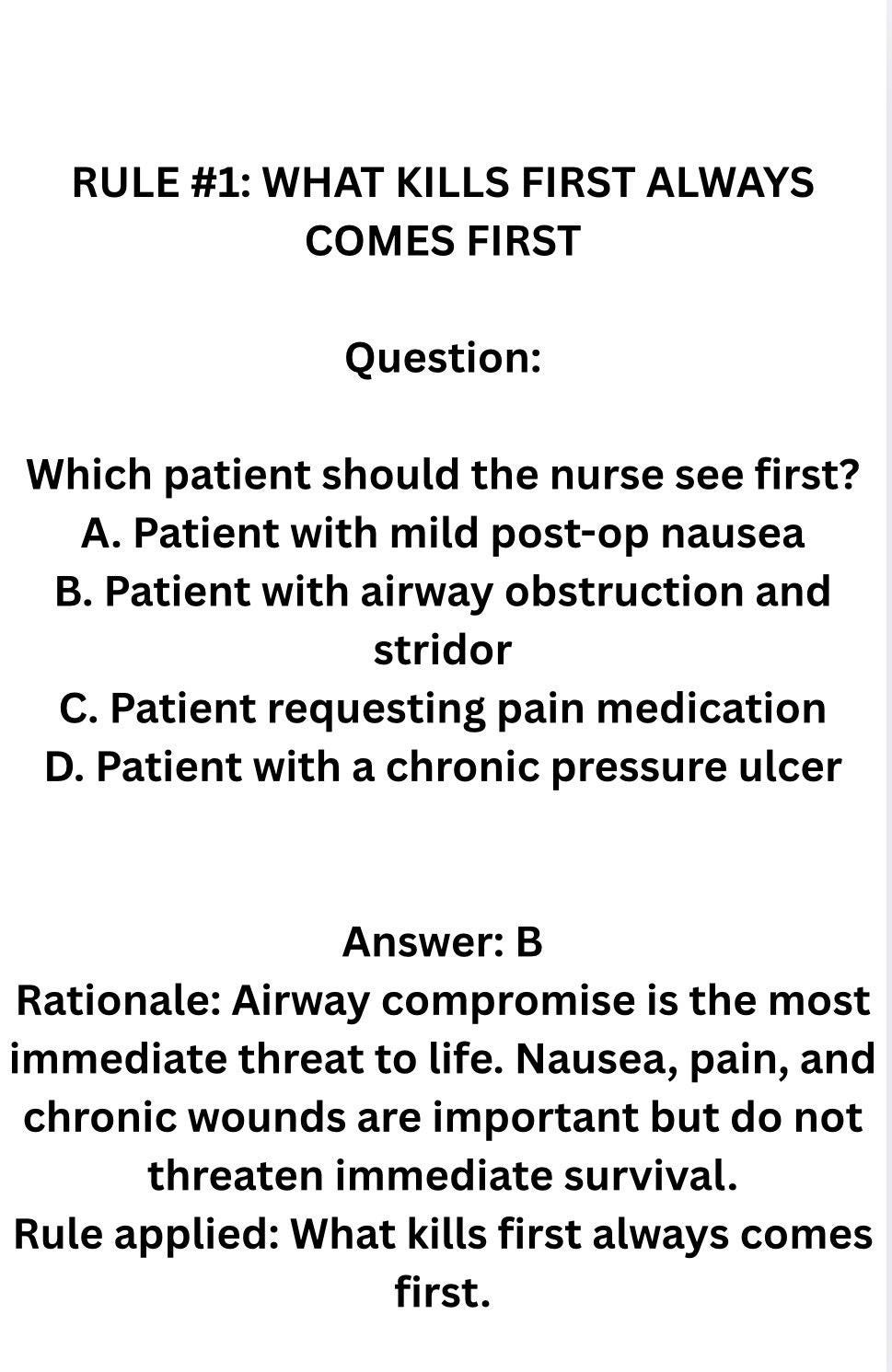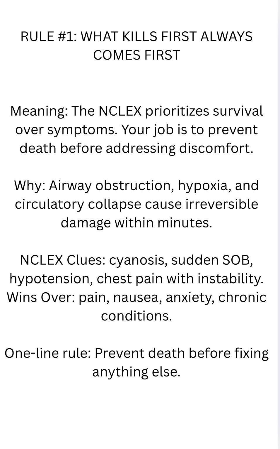 *20 comprehensive priority rules explained in NCLEX logic and bedside reasoning *Clear rationales and one-line memory rules for each priority principle *Realistic NCLEX-style questions for practice, covering adults, pediatrics, post-op, and critical scenarios *Tips for handling airway emergencies, circulation problems, safety threats, labs, vital signs, and pain *Guidance on when to assess vs intervene *Bonus mental status, pediatric, and post-op prioritization tips