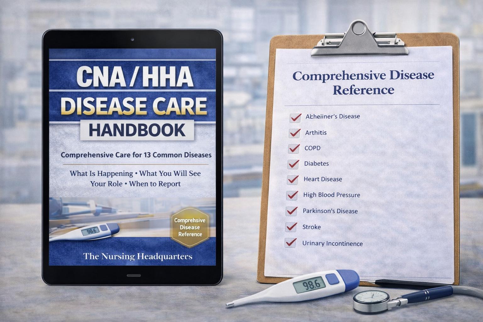 This CNA / HHA Disease Care Handbook was created for nursing assistants and home health aides who want to understand what is happening with their patients, what changes matter, and when to report concerns immediately.
